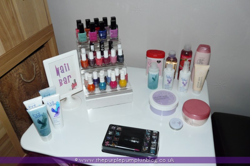 As an Avon rep I’ve got access to lots of toiletries and cosmetics, so it was easy enough for me to stock up on products for us all to use. I set up a nail bar in the corner of the room with lots of different coloured nail polish, lotions and potions! I also bought some nail art jewels which I thought would be fun!