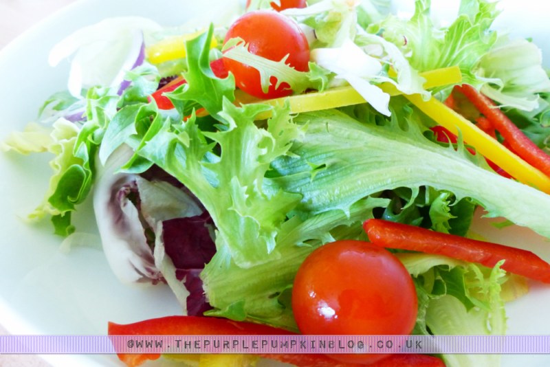 I bought a pre-made salad, so the prep was simple – rip off the plastic lid, wash, and dump it into a serving bowl! The salad had a couple of varieties of lettuce, cherry tomatoes, red onions, and bell peppers.