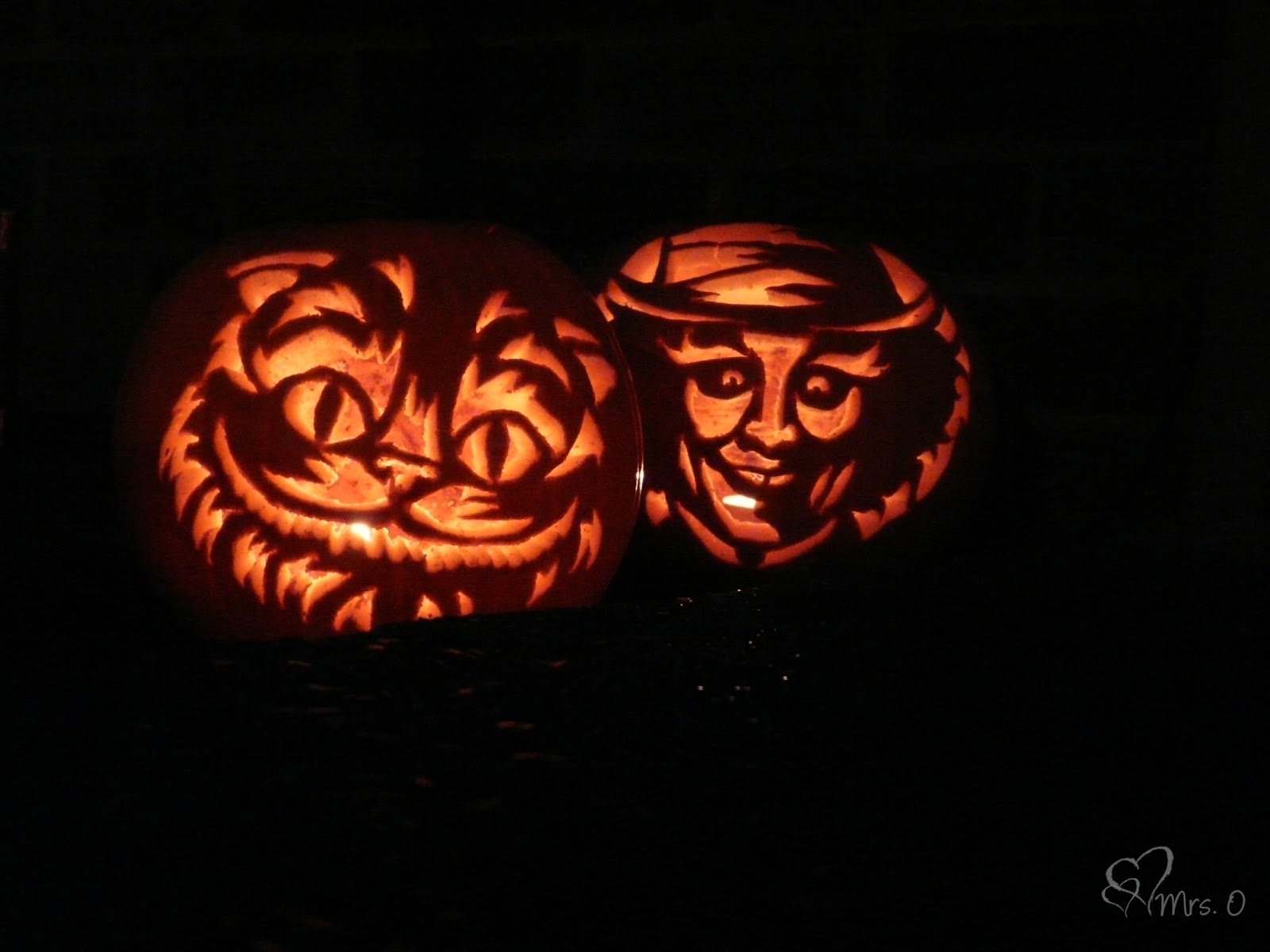This year I’ve “only” carved two pumpkins – The Cheshire Cat and The Mad Hatter – I LOVE them! They’re sitting outside, and the trick or treaters have already started knocking!