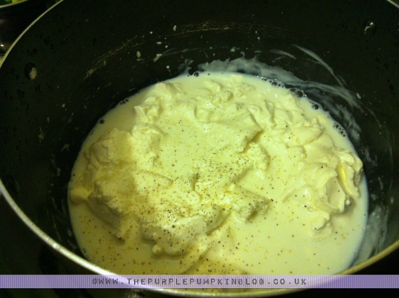 I made a cheese sauce using soft cream cheese and milk…I heated these ingredients up and stirred to form a smooth sauce, and then added black pepper, grated cheddar cheese and parmesan. You may find you need more or less milk, just eyeball it!
