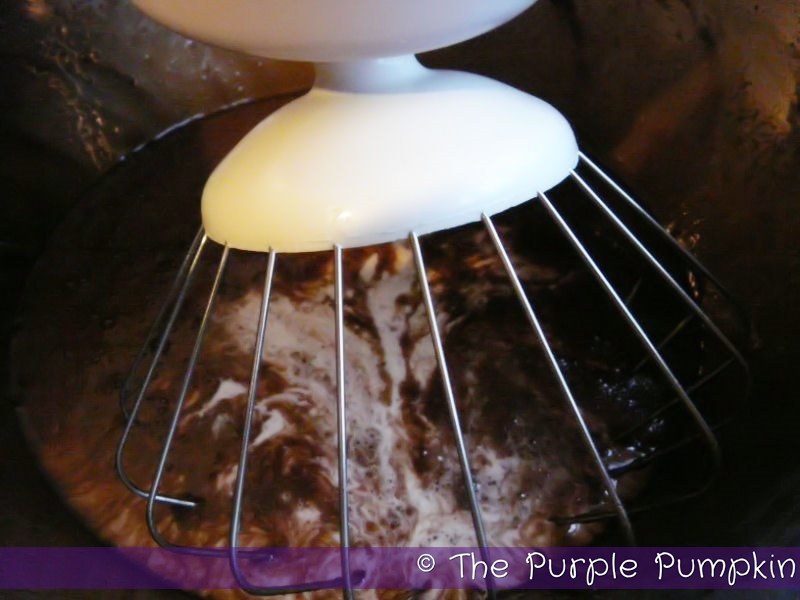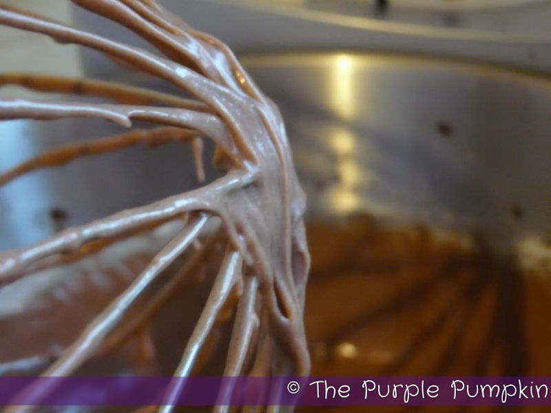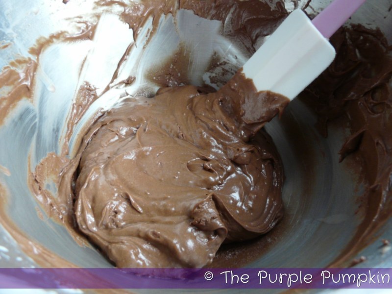 Melt the butter and pour into the sugar and cocoa mix. As I was beating the mixture as directed by the original recipe I realised that this wasn’t going to turn into frosting and needed to be thinned out to make it spreadable, so I added some milk. Add splashes of milk and beat in between to get a smooth spreadable consistency. If it becomes too runny, just add some more icing sugar back in.