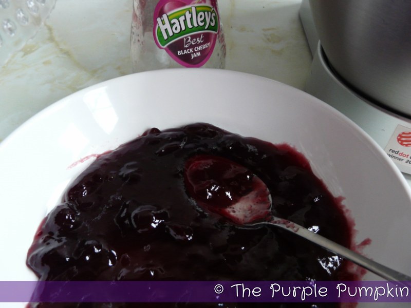 Take the jam and pop into a bowl. Use a spoon to break it up a little. Reserve some cherries to decorate around the edges of the cream layer, then stir the rest into the jam. I had to pit the stones from my cherries, so make sure you do the same if you need to…you don’t want someone cracking a tooth on a cherry stone!