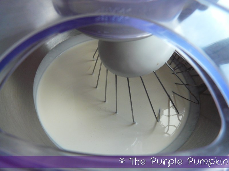 Measure out the double cream and pour into a mixing bowl. Using a whisk, either hand held, stand alone mixer or hand and whisk until stiff peaks form when you remove the whisk. Be careful not to over beat as you’ll end up with butter!