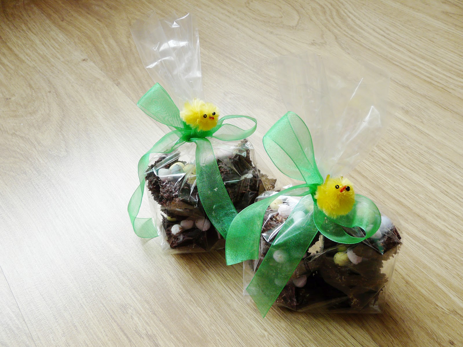 I bagged my chocolate nests in plastic food bags tied with green ribbon and [leftover] mini fuzzy chicks and gave away as gifts for Easter.