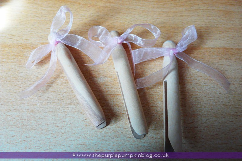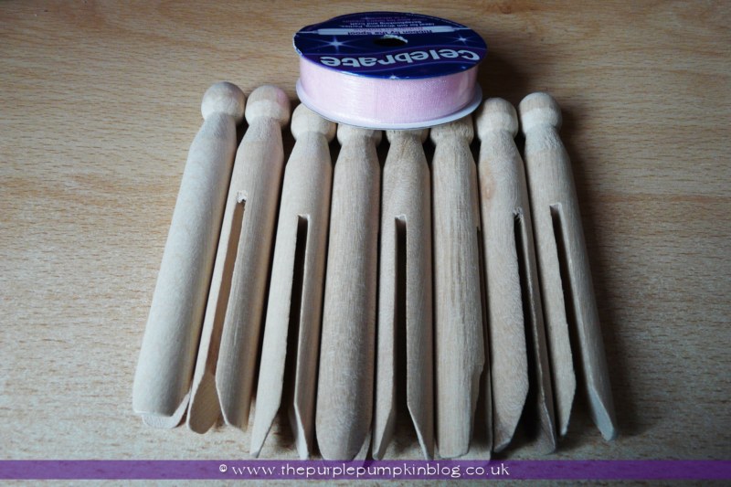 How did I decorate the pegs? I had some old fashioned wooden pegs in my craft stash, as well as some pink ribbon and simply tied the ribbon around the top of each clothes pin into a bow.
