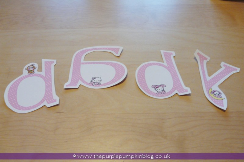 I bought some transfer paper from eBay and created my design in PaintShopPro before printing off and applying to each vest. I kept with my pink polka dot theme that I used throughout the shower, and put some cute characters on each letter too.