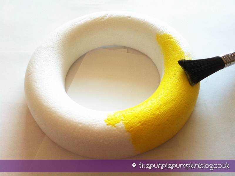 I started off by painting my wreath yellow – just in case there were gaps in the rows of chicks and that way you wouldn’t see the white of the ring underneath. So using a brush and yellow acrylic paint, I quickly applied it and left it to dry for a couple of hours.