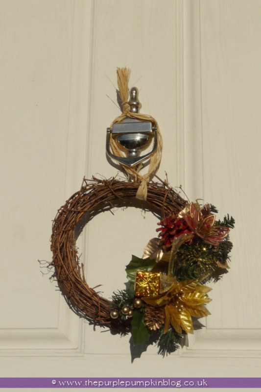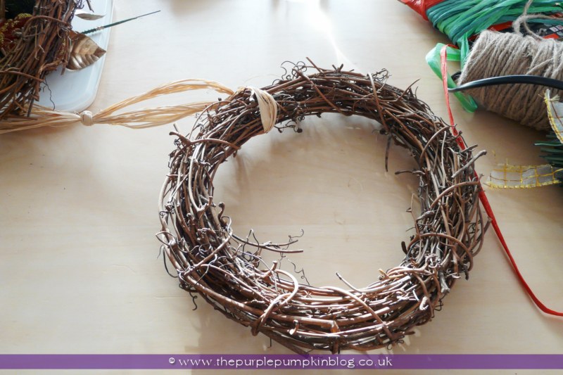 …I’ve called this project easy, because it really was. I bought a couple of twig wreaths from the craft shop, along with a couple of ready made Christmas decorations that had berries, pine cones, poinsettias and ribbons all attached together.