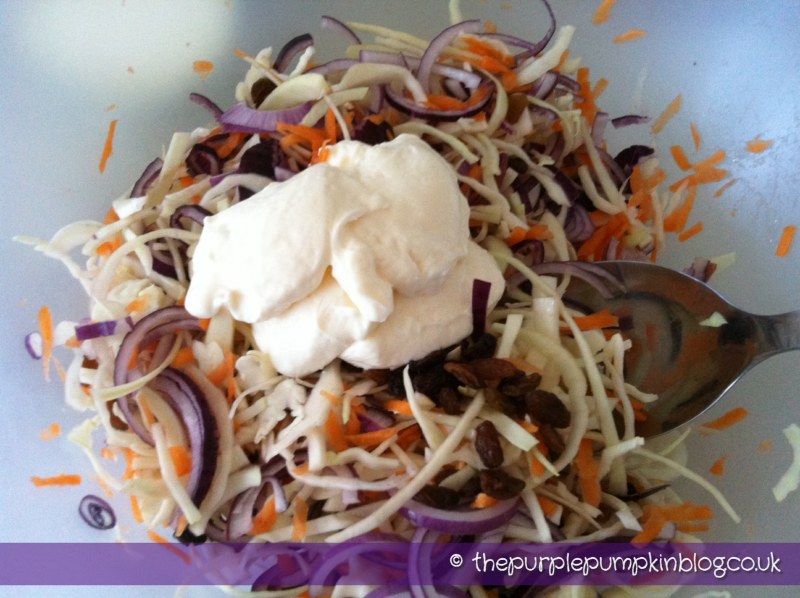 Coleslaw is so easy to make. In mine I use white cabbage, red cabbage, red onions, carrots and mayo, and as I said, to make it fruity, some sultanas!