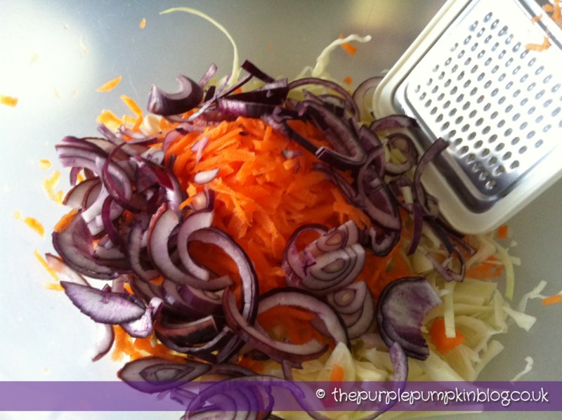 What about quantities I hear you cry? Well, I use half a white cabbage, quarter of a red cabbage, a few carrots, a red onion and a handful of sultanas. I eyeball a lot of things that I prepare and cook on a regular basis – this being one of them.