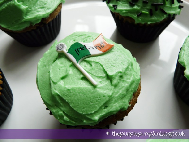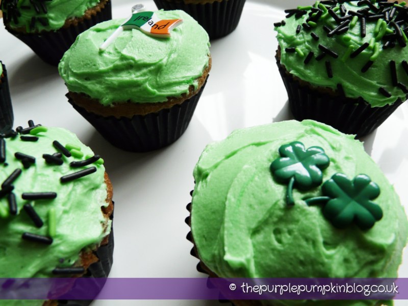 I smeared the butter icing on with a pallet knife and then sprinkled some with green and black sprinkles and the rest topped with some Irish toppers I found in a craft shop (non-edible).