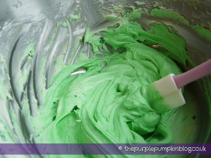 Onto a wire rack to cool and then decorated with butter icing which I coloured green (of course!) You will only need half of the mixture given in the linked recipe.