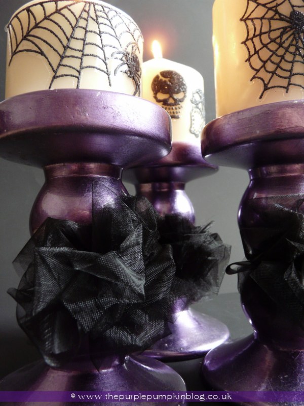 Home » CREATE » Crafts » Halloween Crafts »What’s this? Actually posting day 15 of Crafty October on the actual day? Amazing I know! Today I made some organza bows, and after remembering the purple candlesticks I bought a little while back, decided to the bows to the sticks, and voilà…Halloween Candlesticks!
