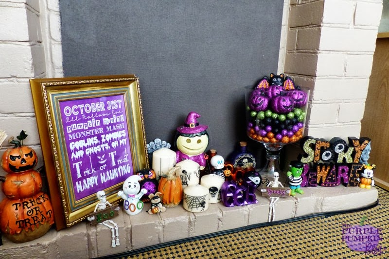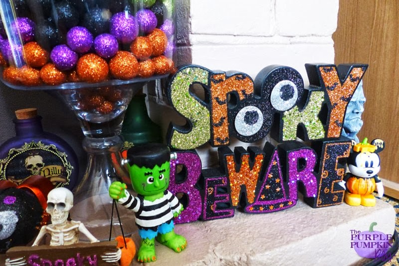 The jar that I filled with glitter balls and purple pumpkins went in the other corner and using decorations with varying heights and styles I created a display that I just love to look at!