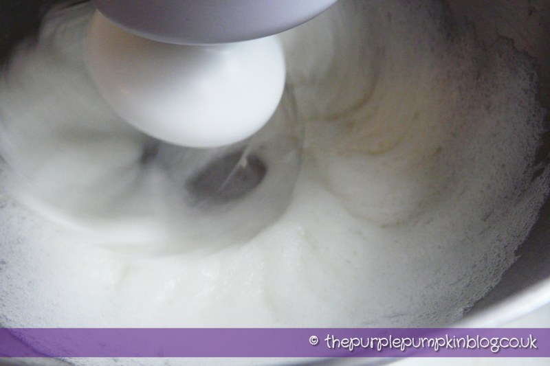 You need to measure your egg whites in weight. This recipe requires 125g egg whites, which was just under 4 eggs – what joy that was to get right! And you may remember I mentioned my first mess up by managing to get yolks into my egg white >_< With the eggs weighed (and aged as I said earlier) it is time to whisk them with egg white powder and a pinch of salt