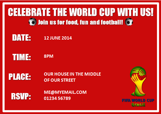 Of course, you don’t have to send a formal invitation – but there is something nice about receiving an invite, even by email, to a party or event. I made one to email around to my friends and family inviting them to our FIFA World Cup Party.