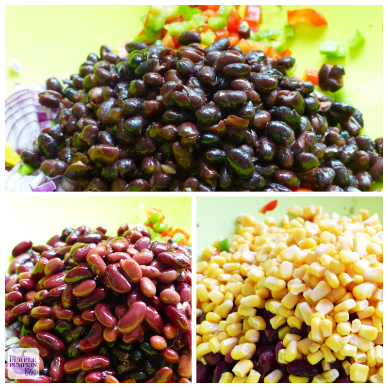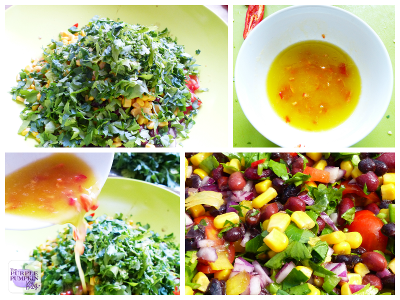 A few veggies are chopped up into small pieces – red onion, cherry tomatoes and colourful bell peppers. They go into a large bowl with black beans, kidney beans and canned sweetcorn. Fresh herbs are stirred in with a dressing made with olive oil, lime juice and red chilli pepper.
