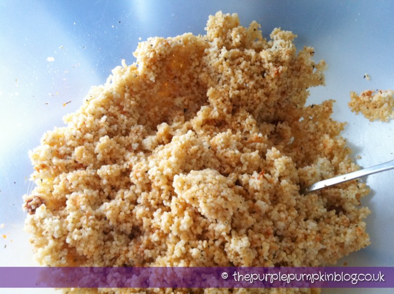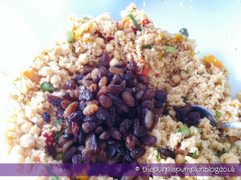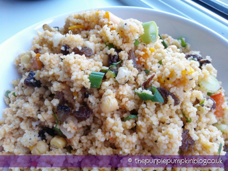 Couscous is wonderful stuff! It’s so easy to prepare and soaks up any flavourings offered to it! I always start cous cous off in the same way: I pour some into a container that has a lid, add some herbs and spices – in this case it was dried mint – and crumble in a chicken stock cube. It doesn’t add a chicken flavour, but adds a bit of savoury-ness to it. By all means, to keep this vegetarian, don’t put in a chicken stock cube – add a vegetable one instead.