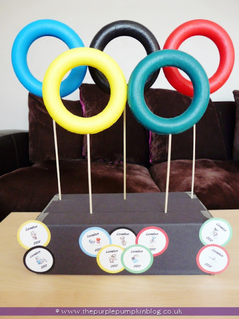 Made with 5 polystyrene rings and paint, you simply paint the rings in the Olympic ring colours – red, black, yellow, blue and green and you’re done! I’m going to be presenting them stuck into a stand, which is why mine are impaled onto wooden skewers! You could also tie some cotton around them and hang from the ceiling.