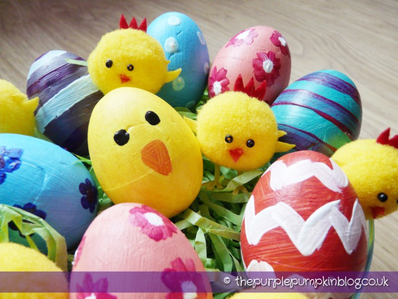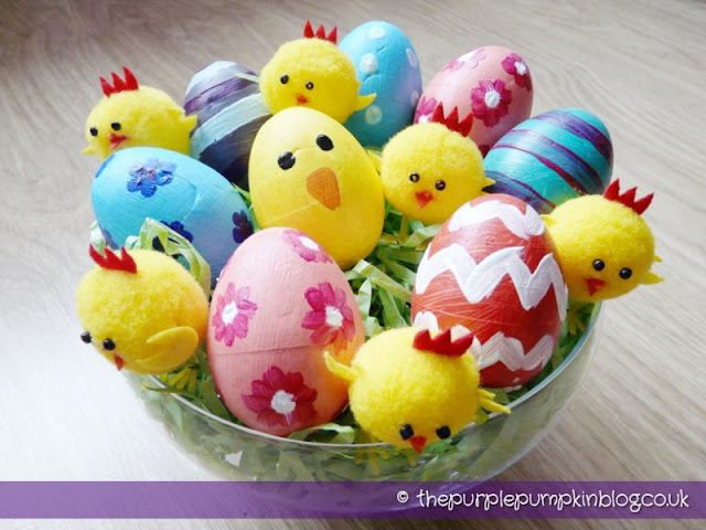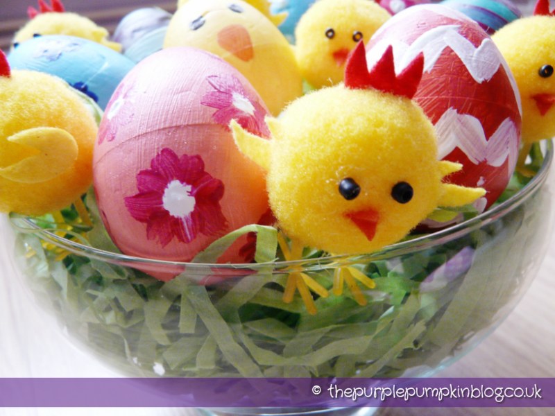 To display them I put some shredded green tissue paper into a glass bowl, placed the eggs on top and then added some fuzzy chicks.