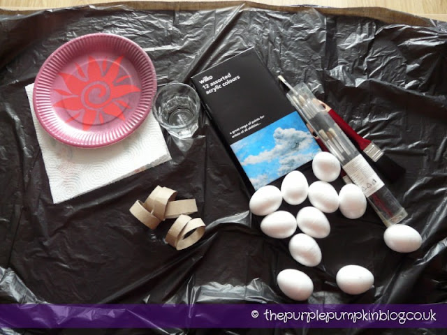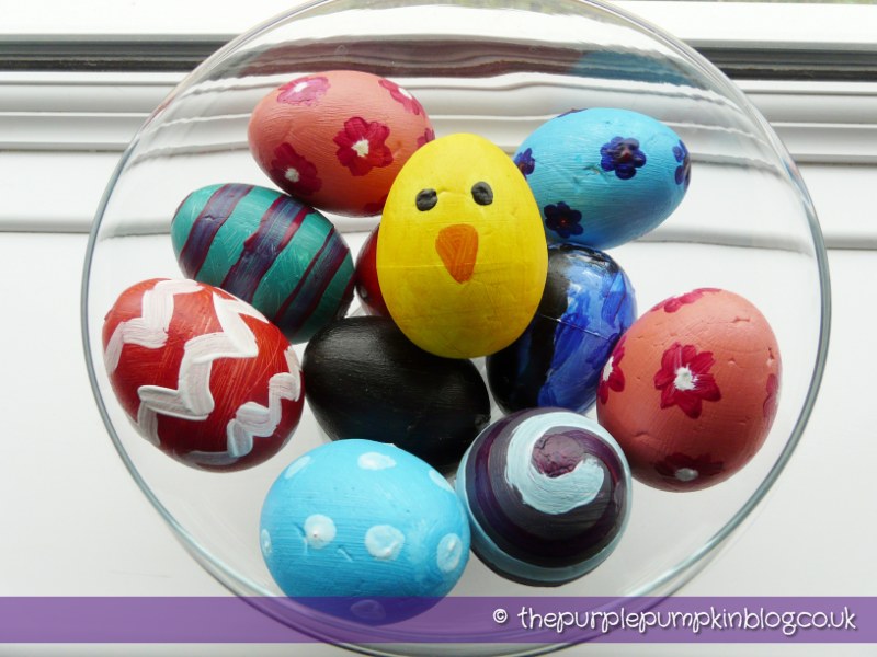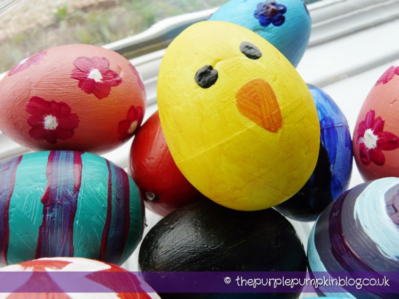 You will notice, in the photo above that there is a distinct lack of wooden skewers – this is because when we started to paint the eggs (I say we, because I managed to drag my 13 year old away from the computer for long enough to have an arts and crafts half hour with his mum!) I thought to let them dry we’d put them on some stands made out of the inner tube from a loo roll…but then we were getting paint everywhere and my son said, we should have used skewers! *ding*