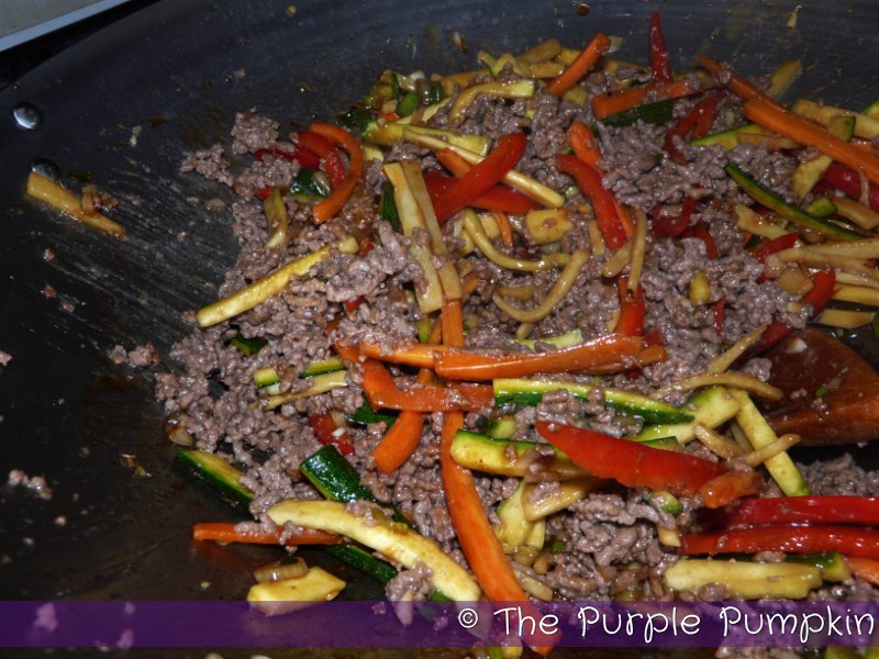 The cooked beef mince gets added back to the wok with the vegetables and stirred together so that the meat is coated with the sauce.