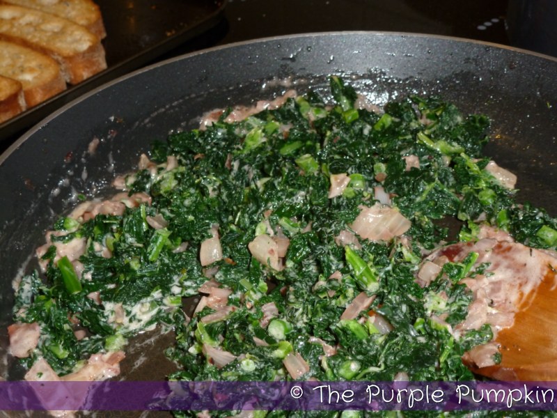 Once I was satisfied that the kale had warmed up, I topped the crostini with spoonfuls of creamy kale and onions.