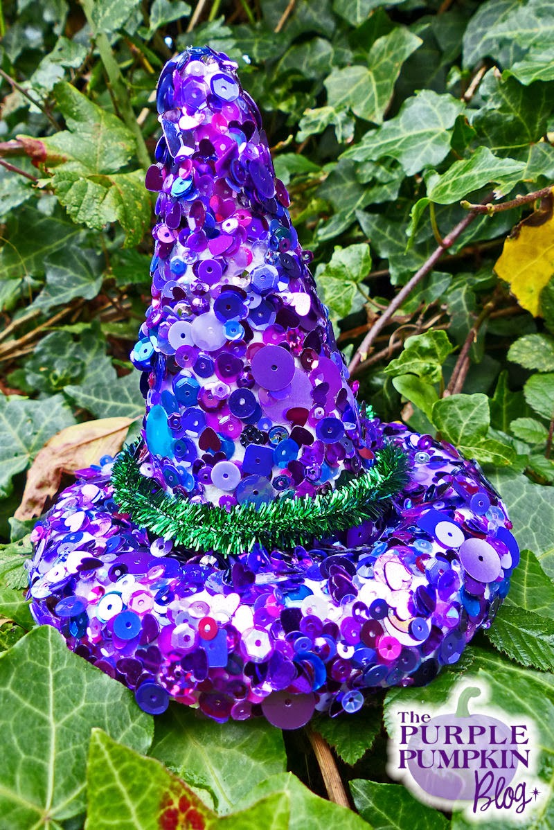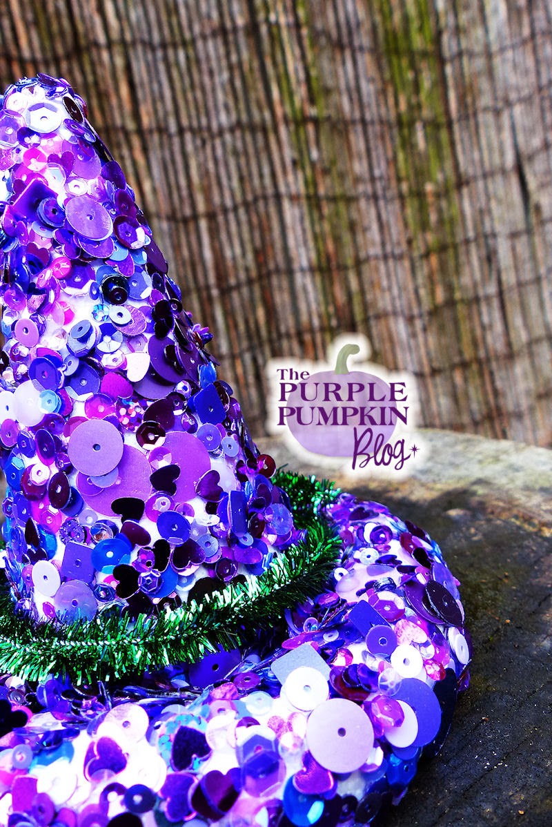 Today I’m sharing a decoration that I’ve made using polystyrene shapes and sequins – for lack of a witty name for it, it is simply a Sequined Witches Hat Decoration! I didn’t take step by step photos, mainly because I was covered with sequins and glue ^_^ but I’ll explain how to make it – it’s quite simple!
