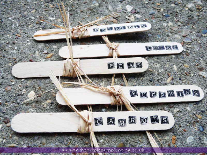 I tied a length of raffia about half way down the ice-lolly stick, just to add a bit of interest really. I then stamped a variety of different veggie names onto the end of the stick (I worked backwards from the end!)