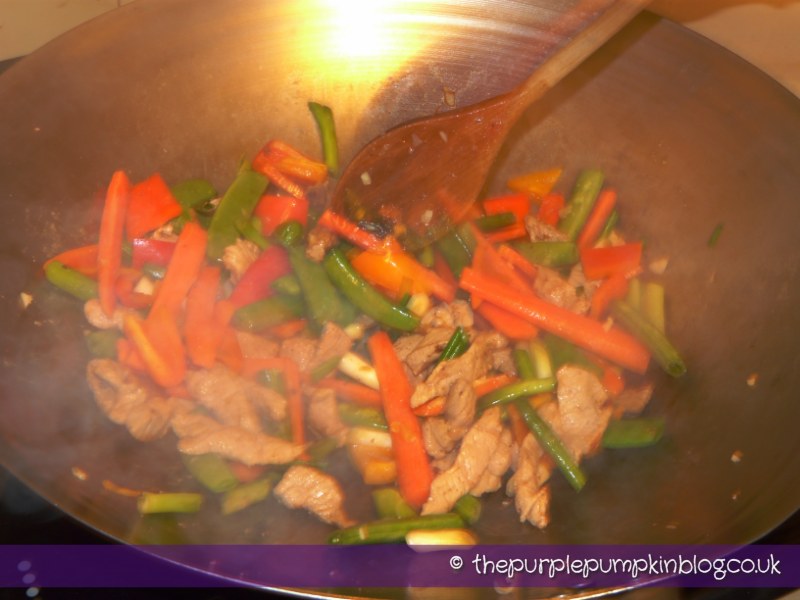 - Heat your wok or deep frying pan and spray with the oil spray. Add the pork strips and stir-fry for 4 minutes until cooked.