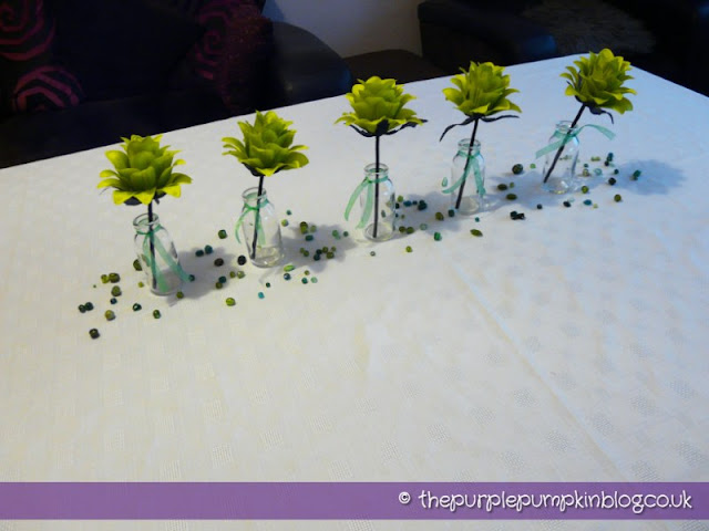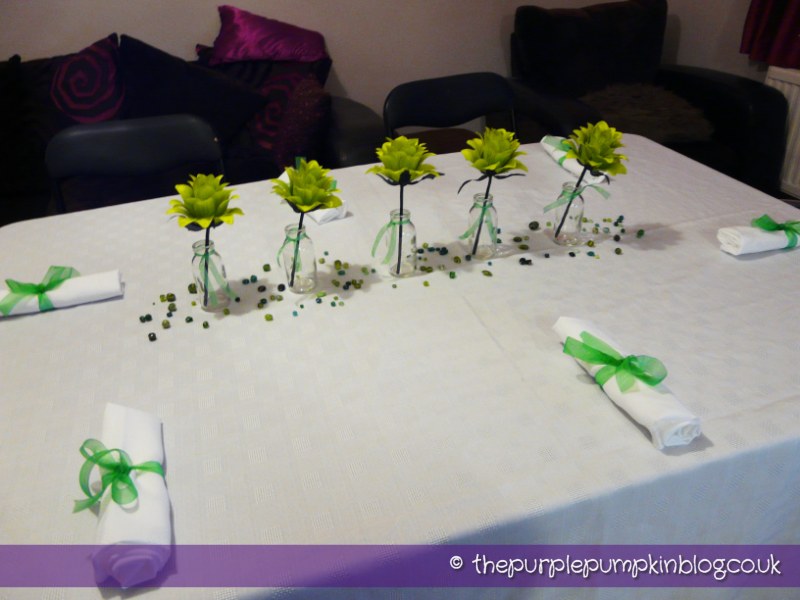 I started with a white table cloth and then set out 5 mini milk bottles (you’ll recognise them from my son’s Nintendo party!) which I tied green ribbon around. Into each bottle I place a faux green flower that came in a bunch of five from a local craft shop.