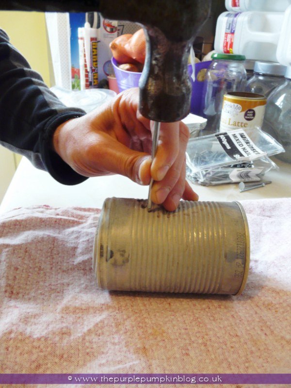 Hubby kindly obliged to hammer holes into the cans – I drew out the pattern for him, and using a nail, he gently tapped a hole through the can into the ice. Not much force was needed, just a tap or two to pierce a hole into the tin.